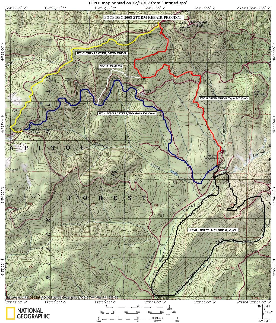 | 12.10 Survey GL#6 from C-4000 to Trail #50: Clear GL#6 from Trail #50 Fall Creek: Blow downs and drainage issues Trail #50: Blow downs and drainage issues Mima Porter #8 from Wedekind to Fall Creek: This section of #8 is in pretty bad shape. There are multiple 100' sections of trail with ruts full of running water. About a mile in there is a pretty big mud slide that took out the trail. It's about 40' wide and still really soft in places. A 1/2 mile in we had to cross either a newly formed or seriously rain filled creek. It looked like it has always been there, but recently widened by mother nature. Another 1/2 mile and we came to a 10' bridge that had been knocked off it's footings. It's still there, but looks like it could go at any time. The remainder of the trail had numerous blow downs, but the trail was in fair shape. 12.23 Work Party GL#6 from C-4000 to C-Line: Cleared trees and repaired water damage. 12.26 Work Party Mima Porter #8 from Trail#50 to lower clear cut Cleared trees and repaired MASSIVE water damage, Jackson rules! 12.29 Survey/Work Party Lost Valley Loop: Mima Porter#8, Trail#20 and GL#6 Smaller trees moved, over a dozen remain through loop, with a very large tree on Trail #20 1.5 Work Party Lost Valley Loop, Mima Porter#8, Trail#20 and GL#6 All clear except for one large tree on #6 Mima Porter #8 from Wedekind to Fall Creek All clear except bridge is out near Wedekind |