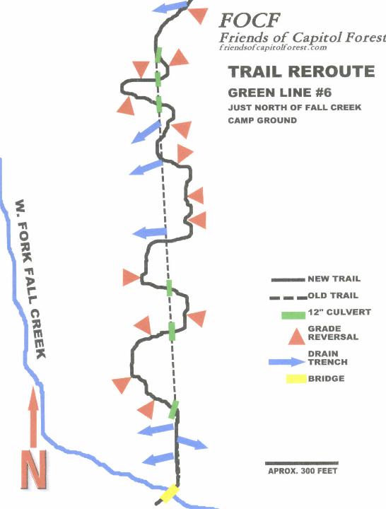 | Why? The trail was originally built straight down an old rail road grade, bad. The trail provided the perfect route for water to drain, down its length, causing serious erosion and creating serious hazards to due its depth and concealed roots and stumps..."The Trough of Doom". The new trail will provide effective water drainage in order to mitigate erosion and a more enjoyable and esthetic route through the forest. |